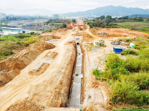 2017年9月開工。目前,下穿車型通道U型槽、箱型通道、排洪溝主體已完成,管廊主體結(jié)構(gòu)已完成45米。